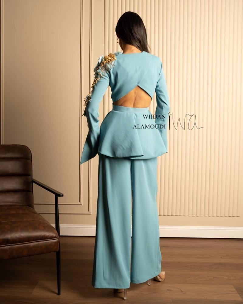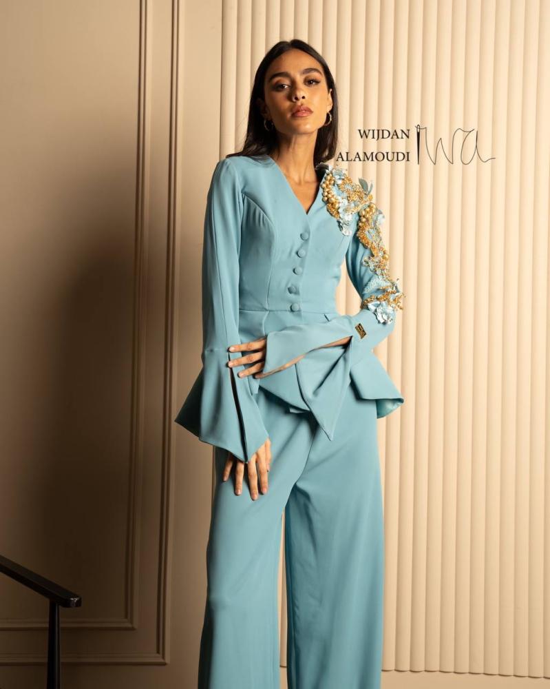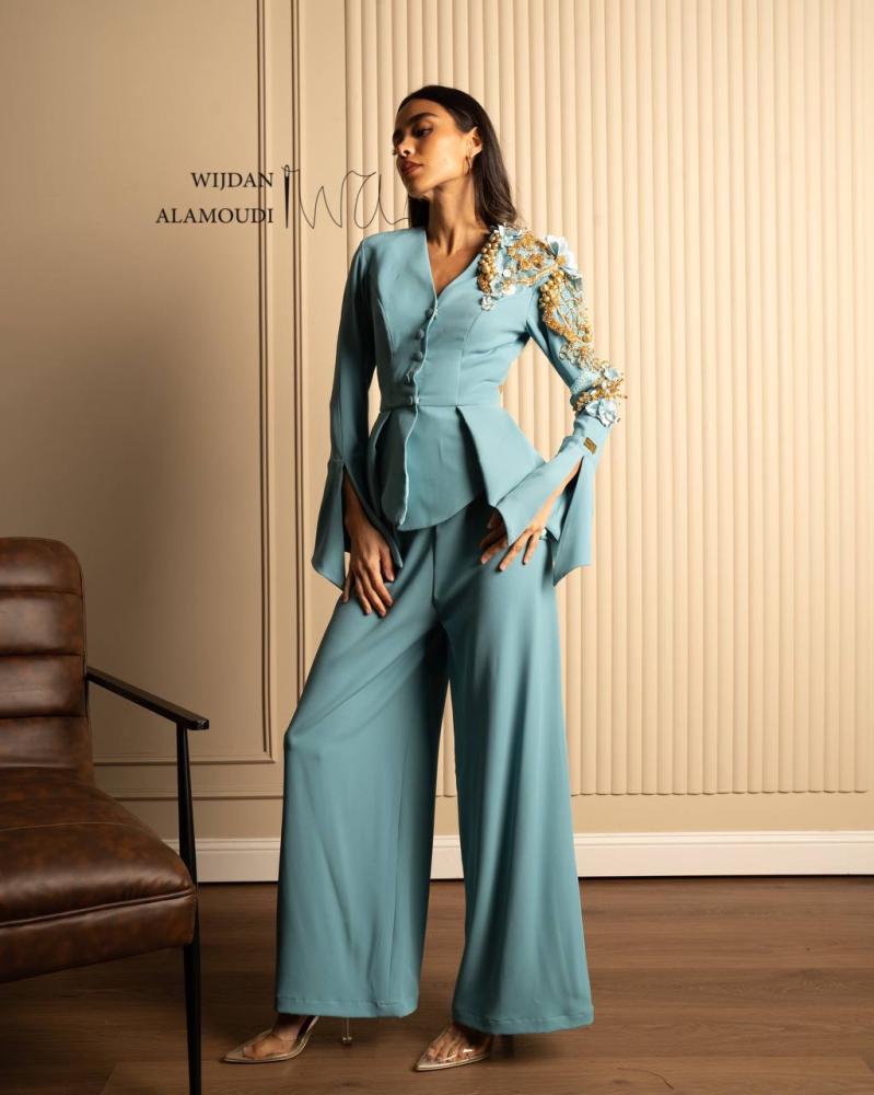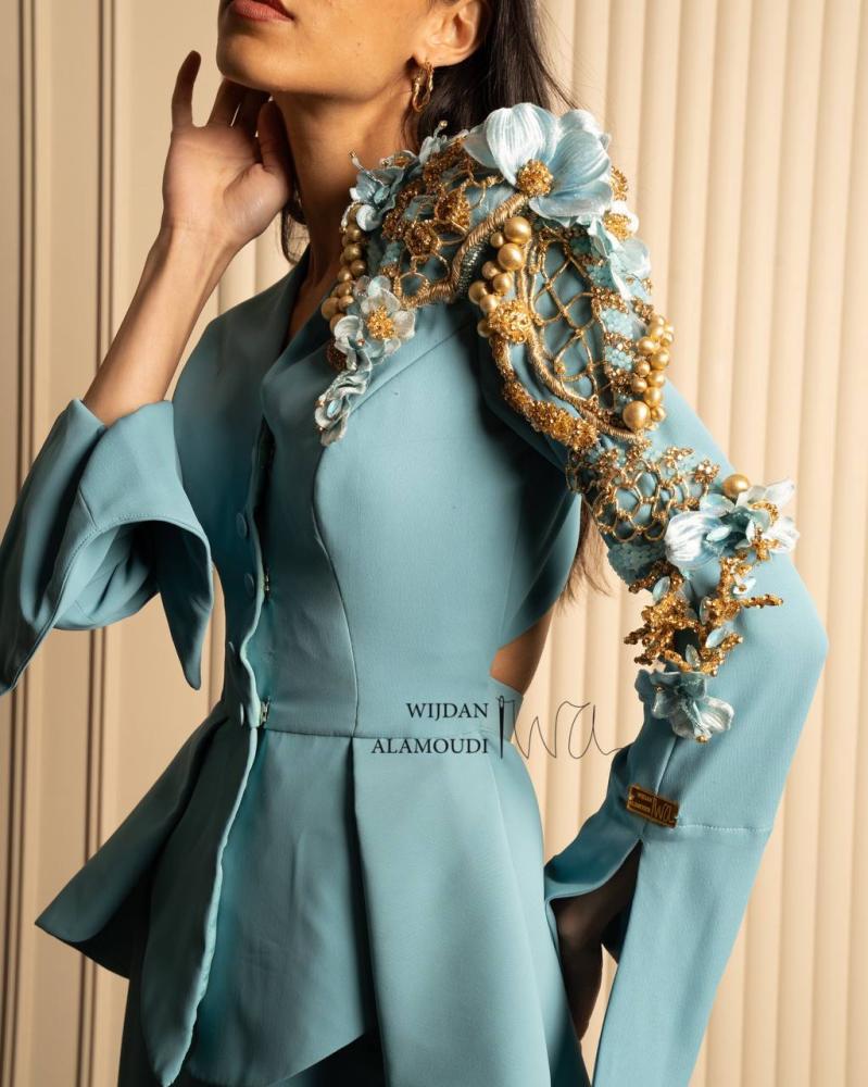 بدلة راقية من قماش الكريب، تتكون من بليزر أزرق بحري بتطريز ذهبي بتفاصيل مميزه  باضافة ورود زرقا وكريستال ذهبي ، وبنطلون أزرق مكمل للاطلالة الساحرة. تجمع بين الفخامة والأناقة، مثالية للمناسبات الراقية.