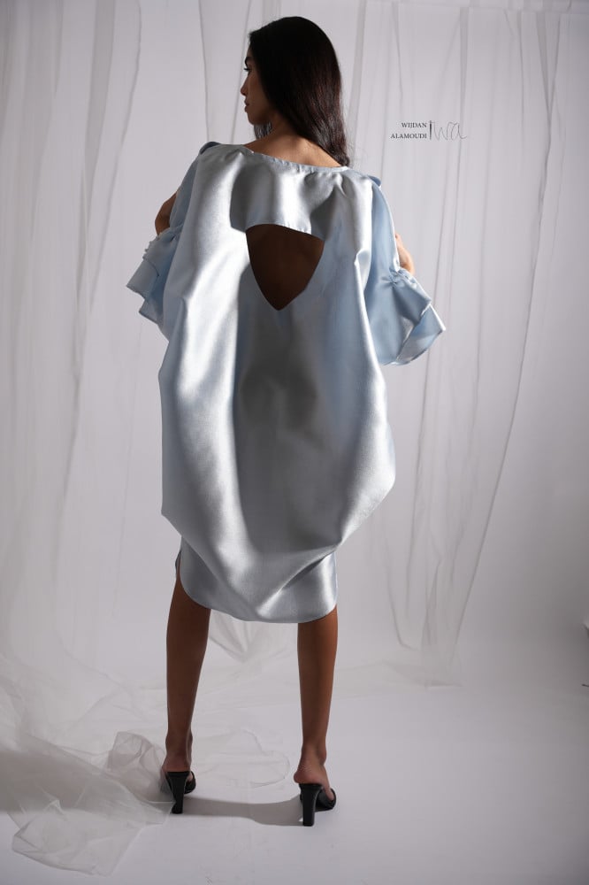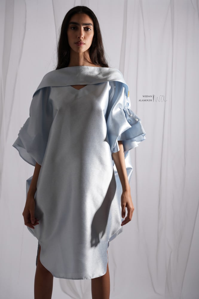فستان بتصميم ملفت وجذاب بأكمام كرانيش مزينة باللؤلؤ مصنوع من قماش التفته الفاخر صنع بعنايه لتتفردي باطلالتك المميزة والأنيقة