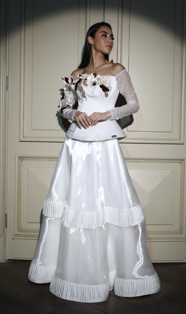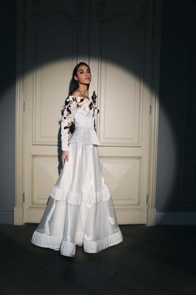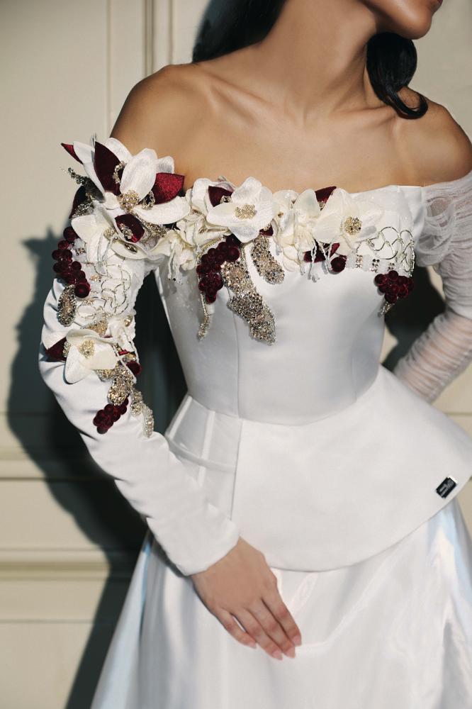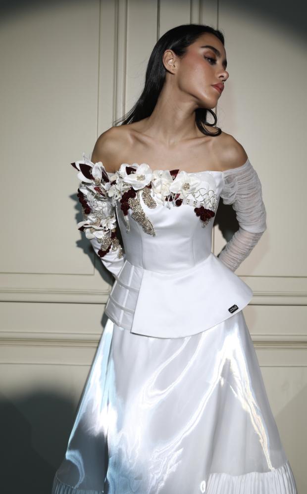 فستان أبيض فاخر من قماش التفته والأورقنزا التركي، بتصميم ملكي يفيض أنوثة ورقي. يزدان الجزء العلوي بتطريز ورد بارز مطعّم بلمسات من اللون العودي والذهبي لتمنح التصميم عمقًا وجاذبية متفردة. أما التنورة فتتميز بتفاصيل كسرات أنيقة تضفي انسيابية فاخرة، ليكون خيارًا مثاليًا لإطلالة استثنائية تلفت الأنظار.