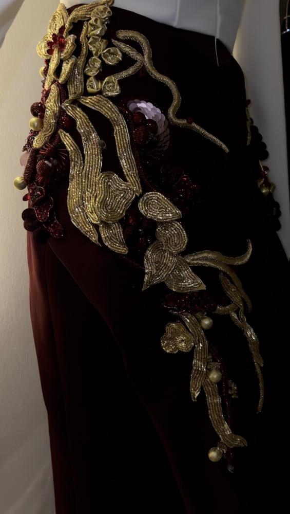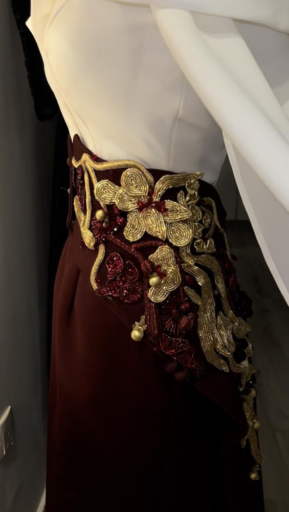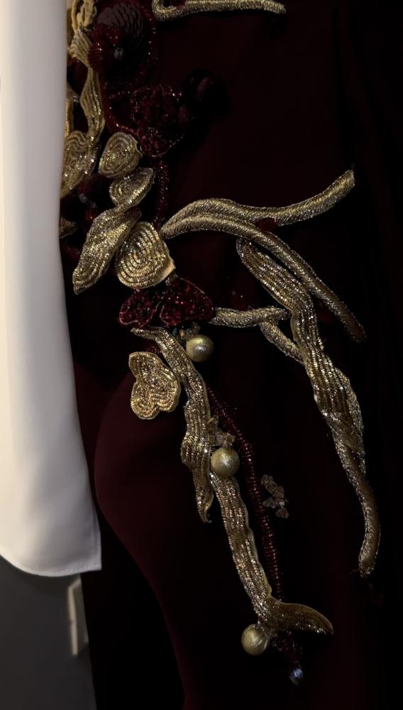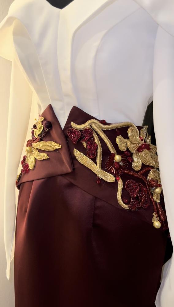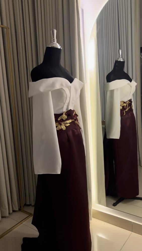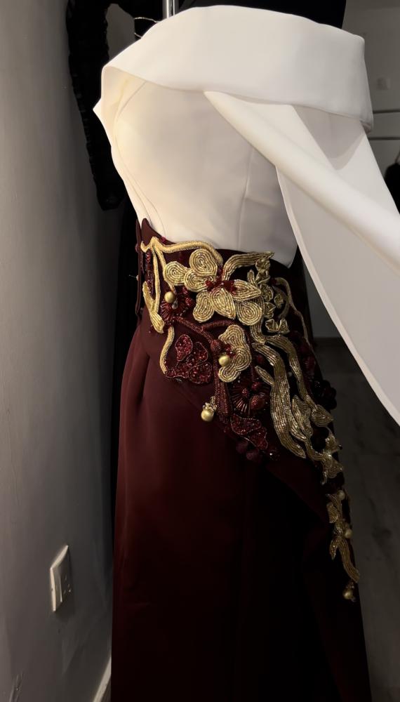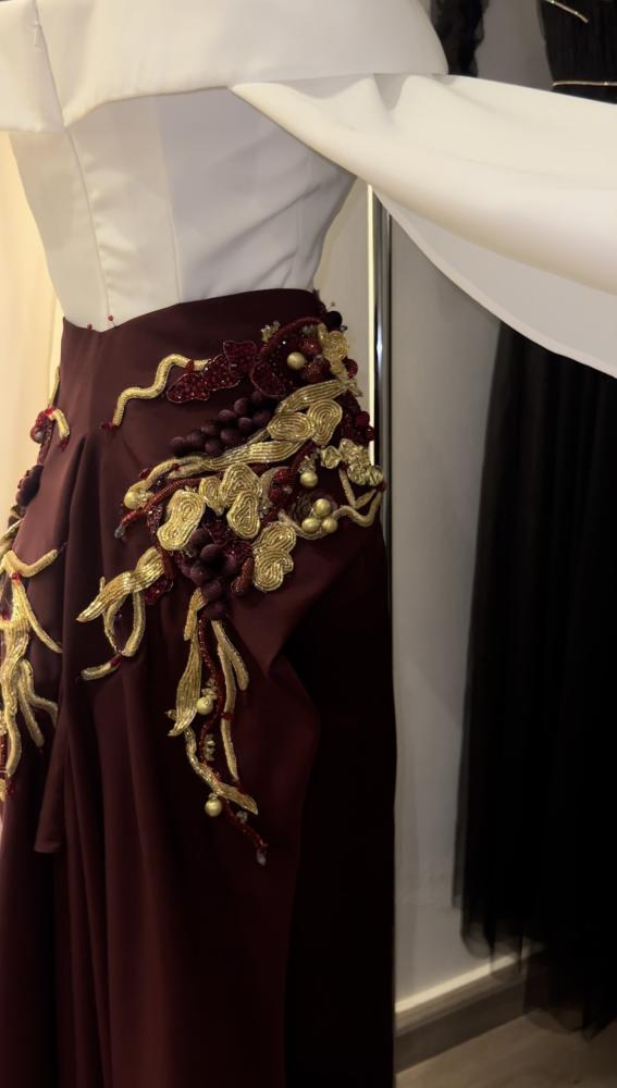 فستان أنيق يتألق بلون أبيض من الأعلى مع قصة اوف شولدر واللون البورقندي من الاسفل ، . يتميز بذيل بورقندي من الكريب مزين بتطريز ذهبى وبوروندي ، مما يخلق إطلالة جذابة ومميزة تناسب المناسبات الخاصة.