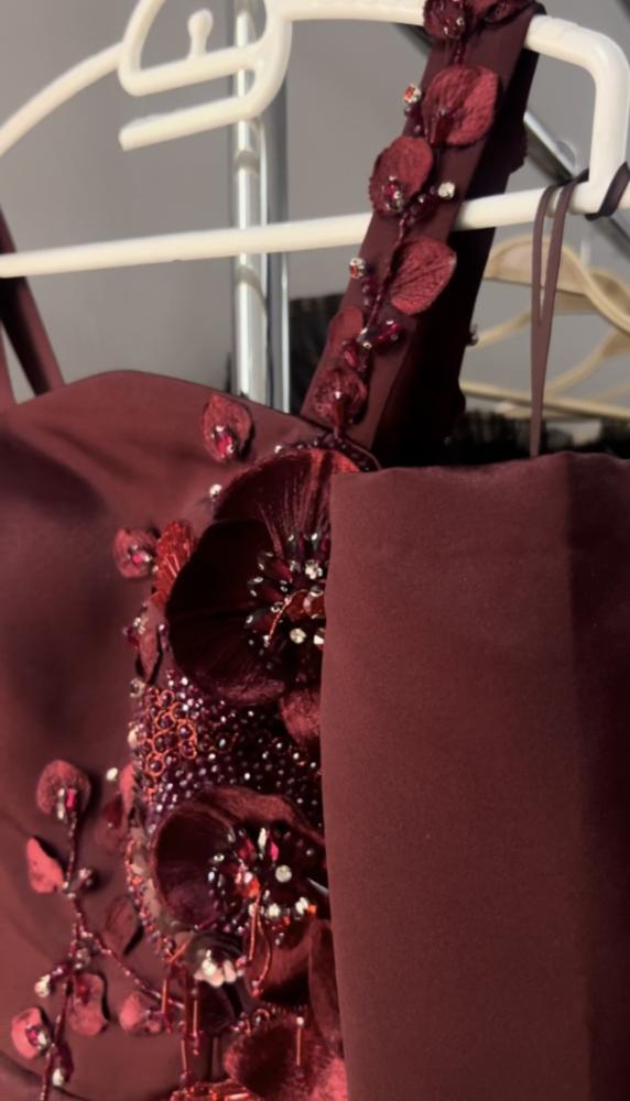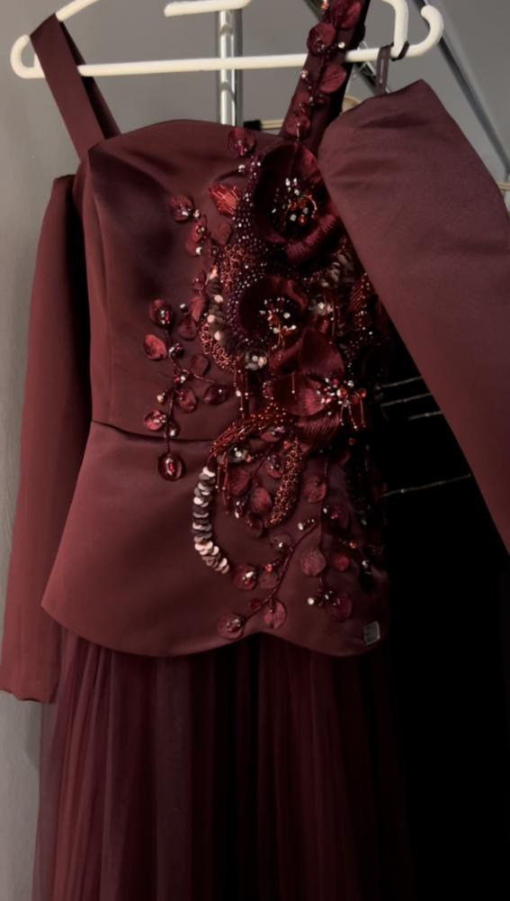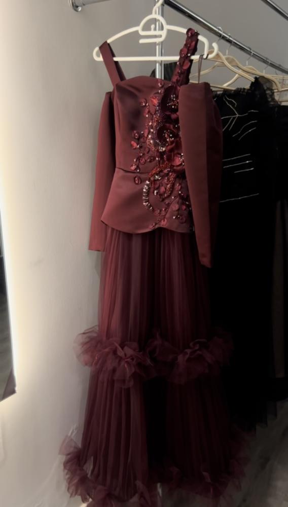 فستان بورقندي من قماش التفته والتل، ، مع تطريز بورقندي مميز وجذاب . يجمع بين الرقي والأناقة، مما يجعله خيارًا مثاليًا للمناسبات المميزة