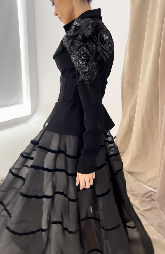 تصميم ملفت وجذاب صنع بعناية لتكوني من افضل الاطلالات في مناسبتكم صنع من قماش الكريب والاورقنزا التركي المشغول بالشكالبارز بخرز السيلان والكريستال الراقي