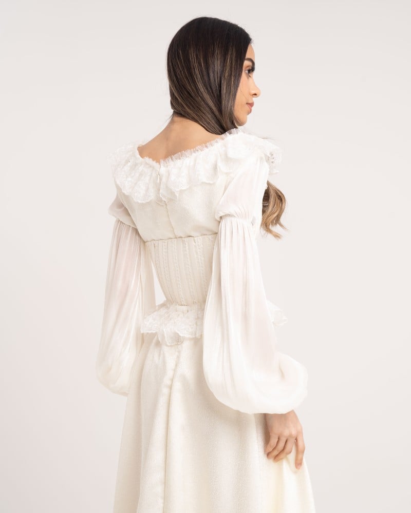 فستان نسائي مميز جدا يجمع بين الاناقة والنعومة ويظهرك بمظهر ملفت وجذاب مصنوع من قماش التفته الجاكار المزين بالدانتيل ومعه كورسيه خارجي بحبال ربط