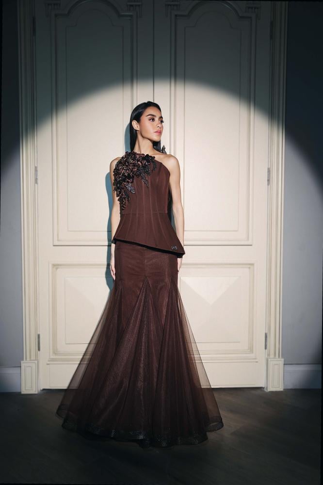 فستان بني فاخر بتصميم أنيق من قماش الكريب مع تنورة واسعة من التل تضفي لمسة فخامة وانسيابية. يزدان الجزء العلوي بعظمات بارزة تمنح القصة ثباتًا وجاذبية، مع تطريز يدوي بورد بارز مطعّم بالكريستال والبلور والخرز ليمنح إطلالة فاخرة تليق بالمناسبات المميزة.