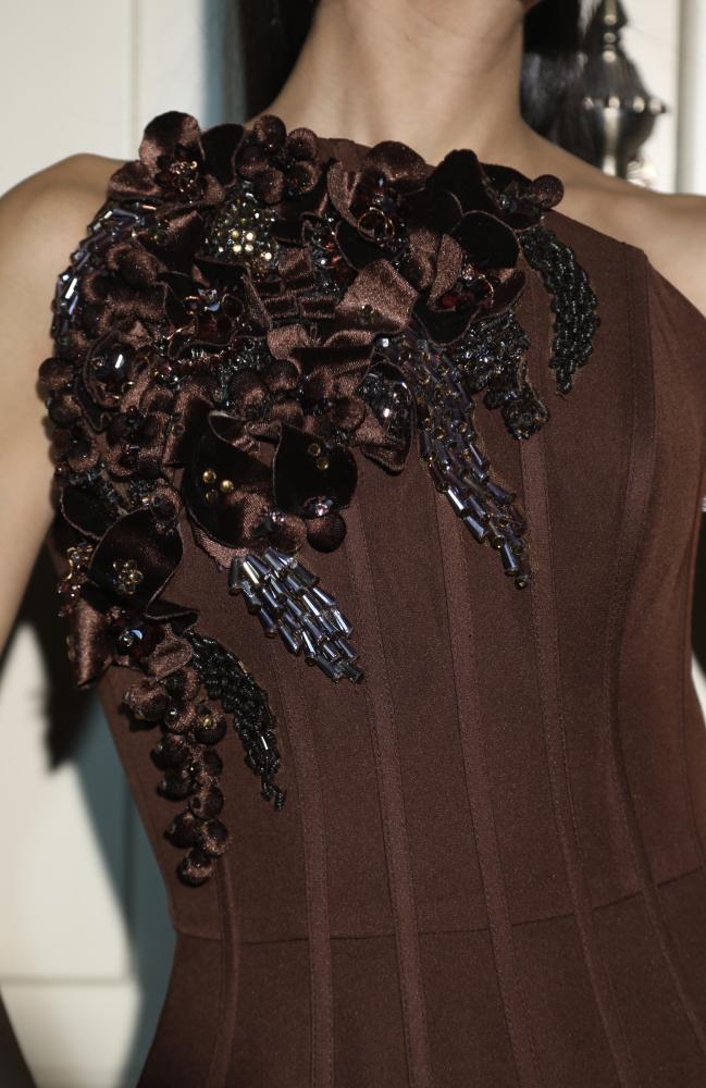 فستان راقي من قماش الكريب البني مزين ومرصع بالورود والكريستال والخرز البارز
