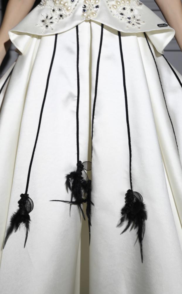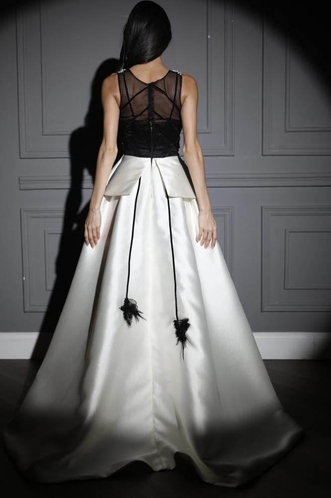 أما الجزء السفلي فهي من التفته الميكادو السكري مزينه بشريط مخمل اسود ينتهى بالريش الفاخر المزين بالتل اضافه خاصة ومميزه لك لإطلالة جذابة وفريدة