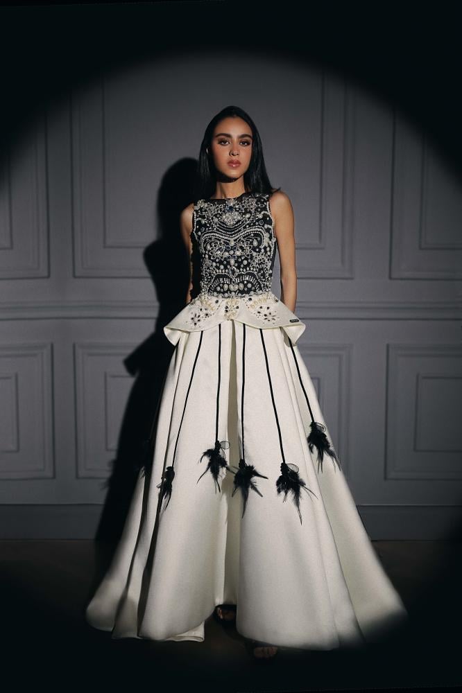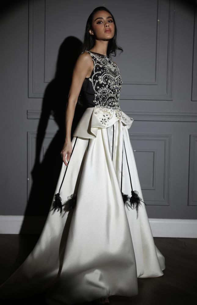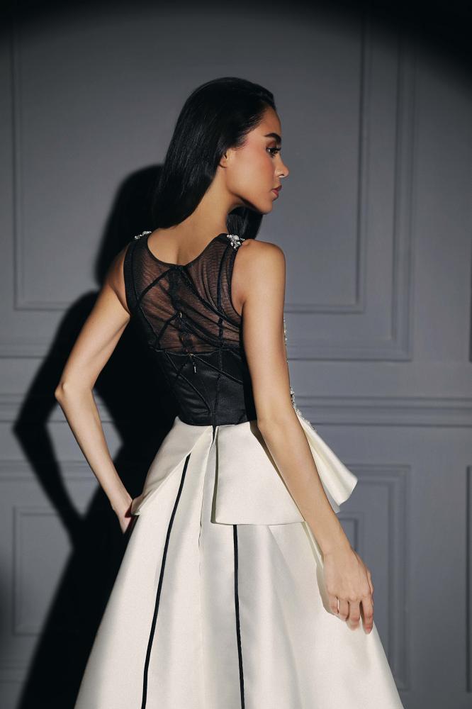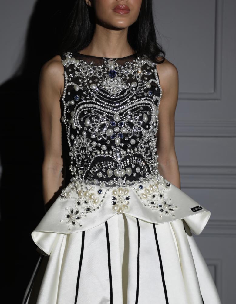الجزء العلوي مشغول بتطريز يدوي فاخر ومرصع بالخرز والكريستال واللولو بشكل فني يبرز منطقة الصدر والخصر يضيف لمسة نعومة وأنوثة.