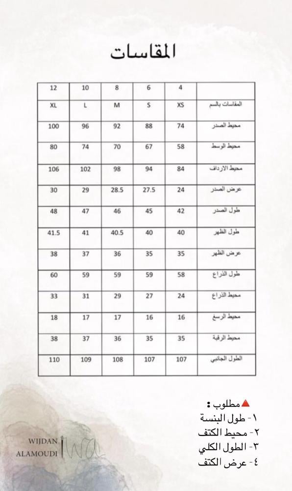 • بعد اختيار المقاس يرجى كتابة طول الفستان المرغوب في خانة الملاحظة