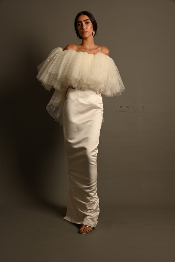 فستان نسائي مميز وجذاب من قماش التفته وطبقات التل البليسيه
