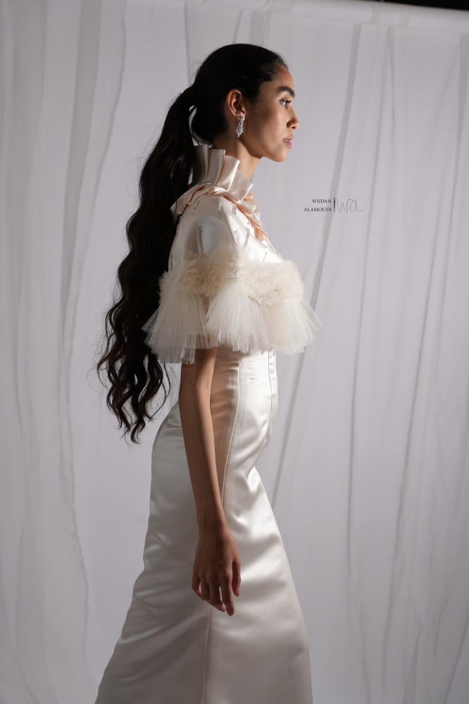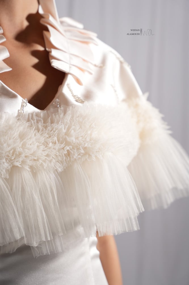 تصميم ملفت وجذاب صنع بعناية لتكوني من افضل الاطلالات في مناسبتكم صنع من قماش التفته الكريمي الفاخر مع ياقه بكسرات ومشغول بخرز السيلان الراقي