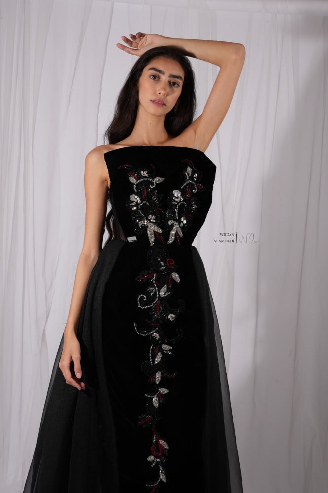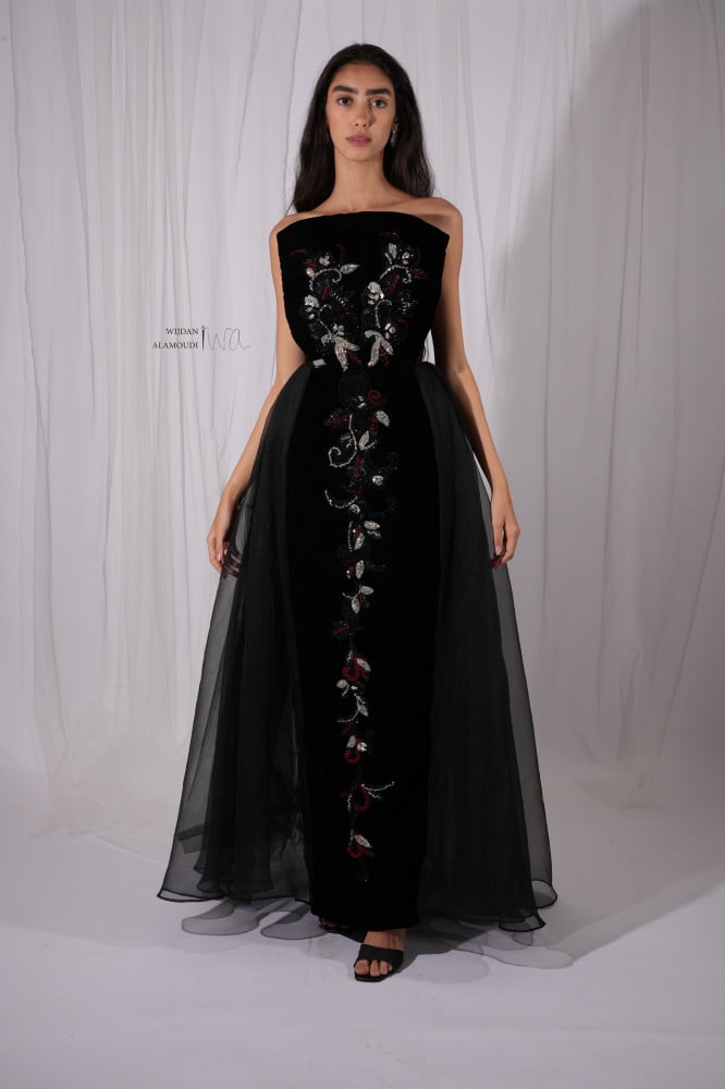 فستان سهرة راقي صنع بعناية لتكوني من افضل الاطلالات في مناسبتكم مصنوع من قماش القطيفة ومشغول بالكريستال والخرز الفاخر