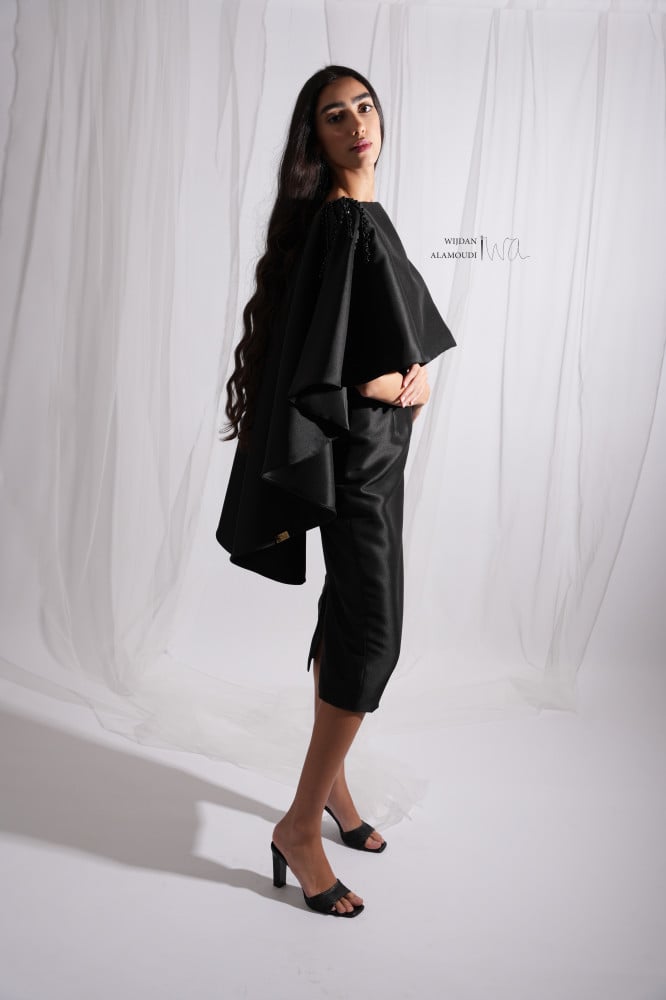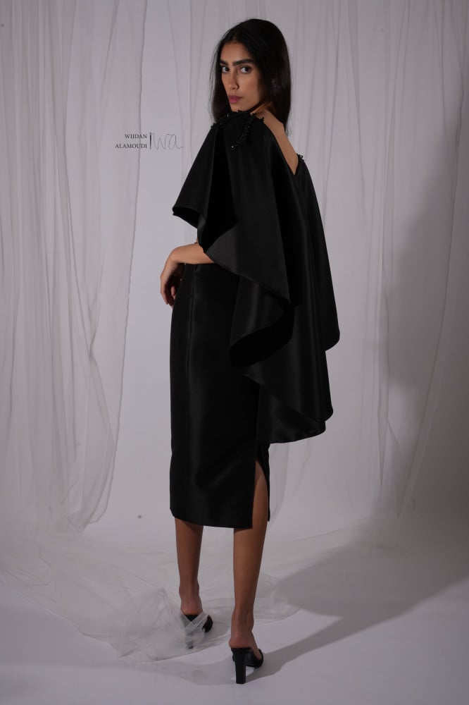 تصميم فخم وجذاب من قطعتين تنوره وبلوزه مصنوع من قماش التفته الفاخر ومشغول بتطريز عند الأكتاف